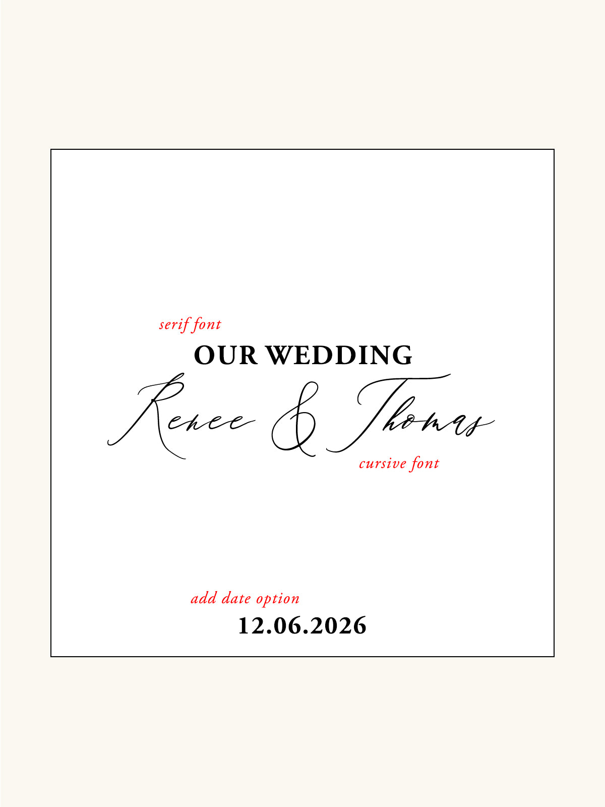 Customisation is where this linen wedding photo album really comes alive. Personalise with first names only using a graceful cursive font for the main line, and a classic serif uppercase font for subtext like the add on spine or date, exactly as our designers recommend for a two-line layout. Choose from a range of text colours: White, Black, Metallic Gold, Red, Pink, or Blue to match your theme or mood.